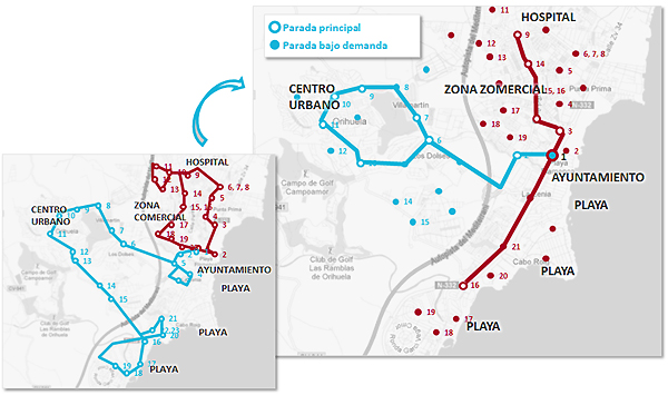 CHALLENGE: With 100,000 inhabitants, Orihuela has magnificent beaches, large residential areas and important seasonal fluctuations of population and tourists. In high season, the public transport of Orihuela is overwhelmed, insufficient to reach everywhere. In the low season, it is underutilized, with vehicles wandering empty across dessertic neighborhoods.