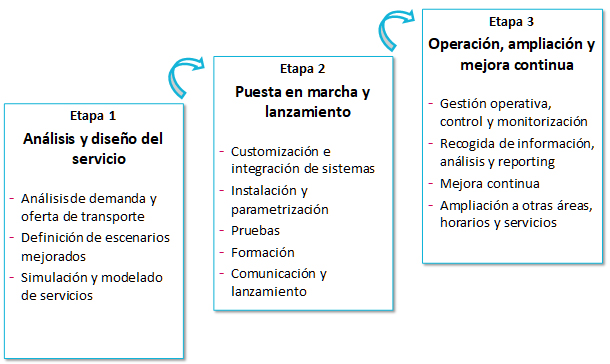 Con Skybus, la puesta en marcha de servicios bajo demanda se realiza siguiendo una metodología estructurada en tres etapas, plenamente gestionada y de eficacia probada.